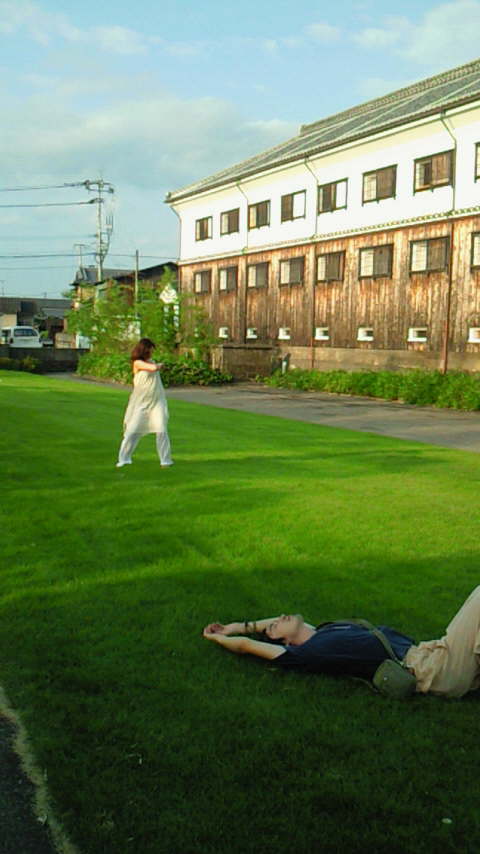 酒蔵横の芝生でアップ中のマナちゃんと